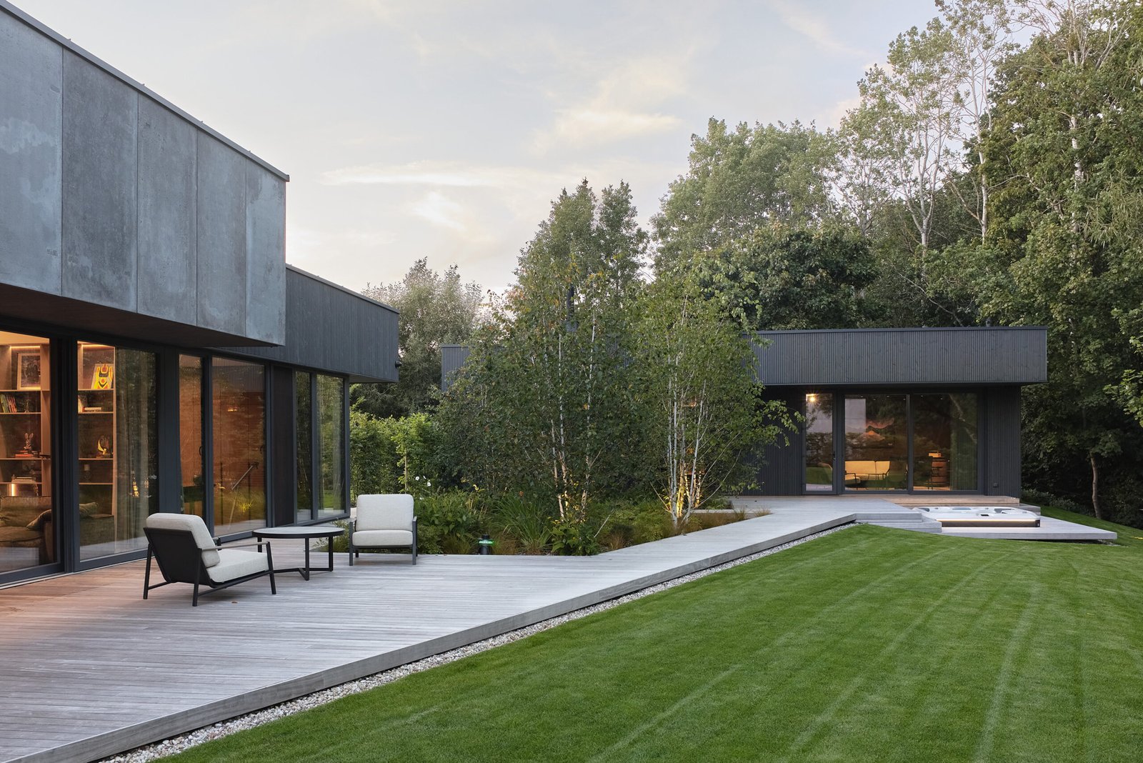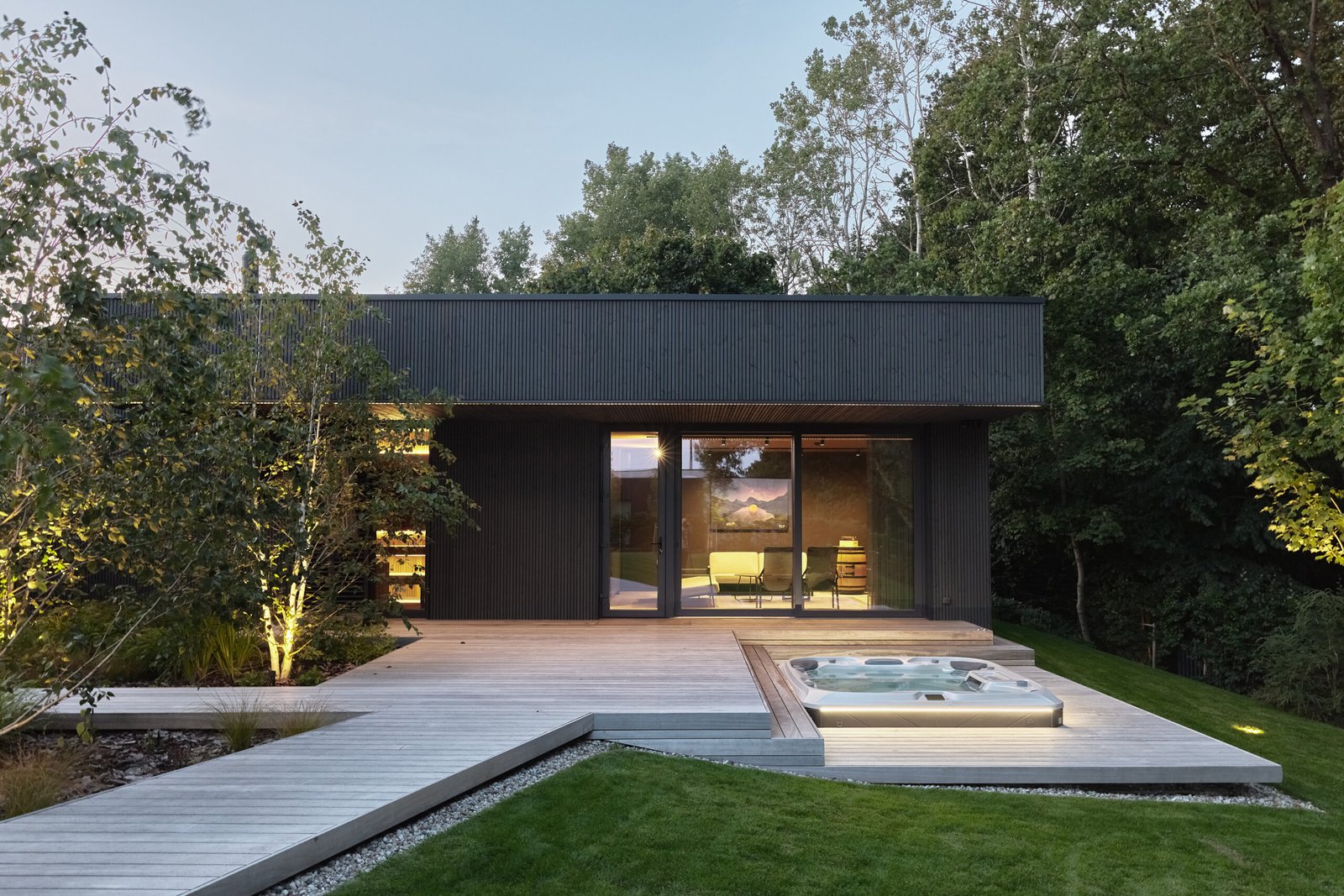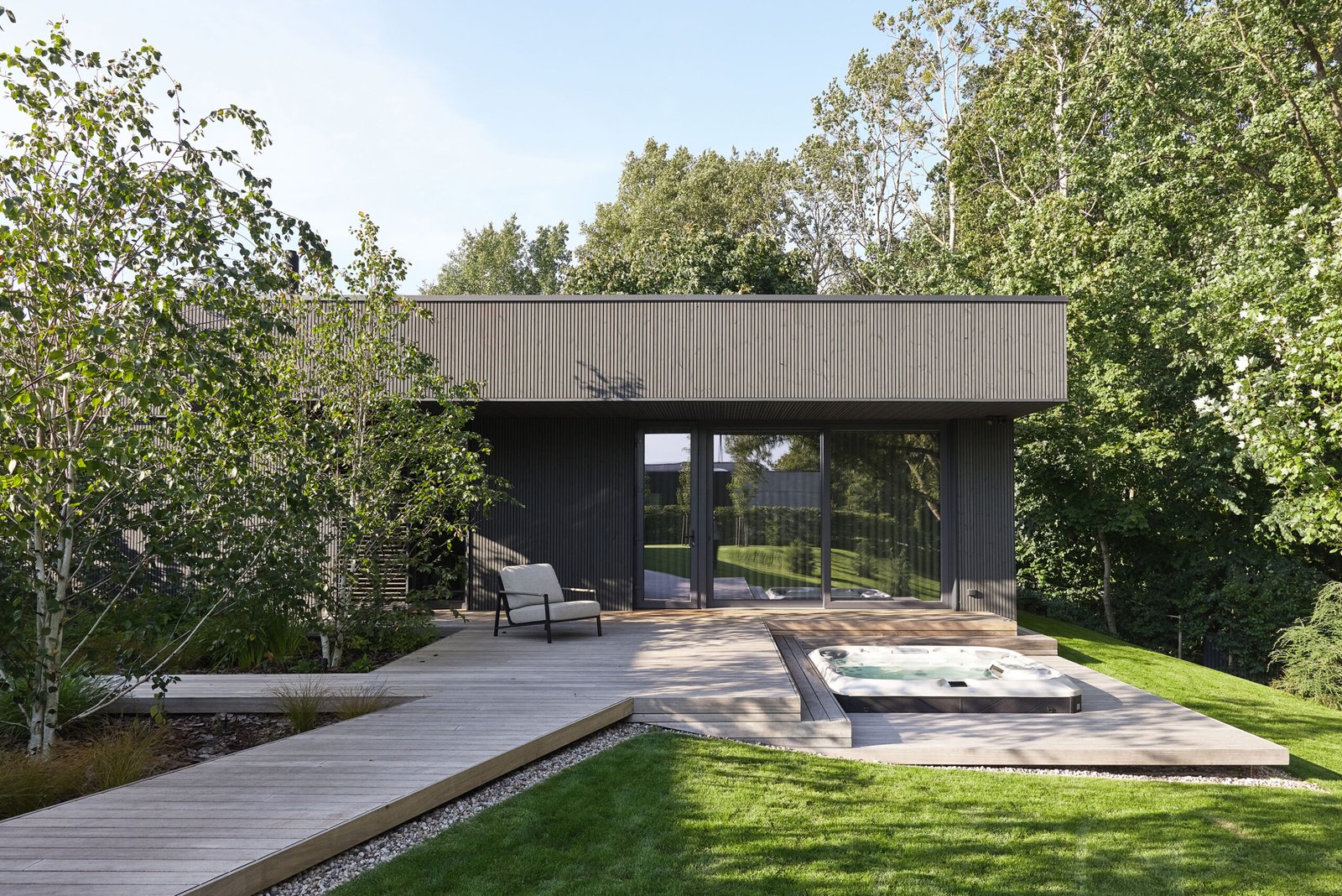In addition to the main volume, the plot includes a separate SPA building. It contains a sauna and a relaxation zone, and its position in the landscape allows the family to disconnect and enjoy nature more intimately. Moreover, the SPA structure works together with the main house and the courtyard, creating a sequence of exterior and interior moments throughout the site.