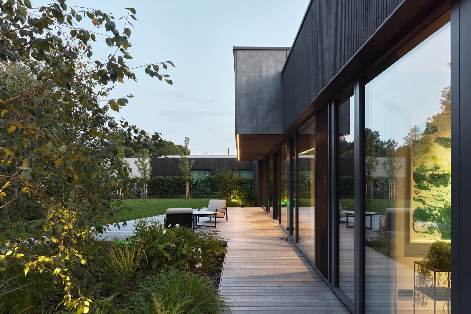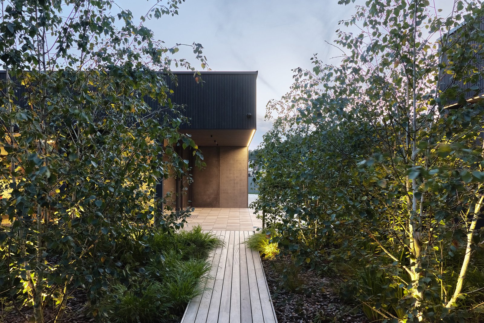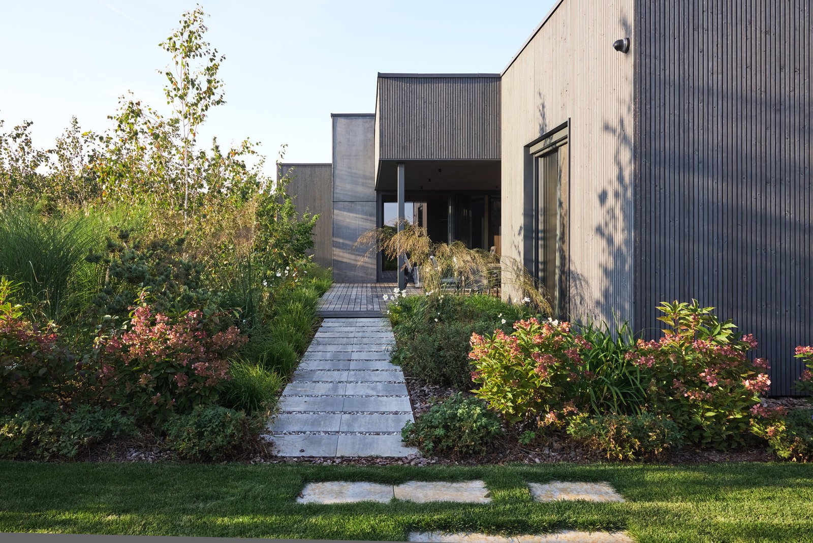 A comprehensive landscape project shapes the entire plot. Pathways, greenery, terraces, and framed views guide movement and enhance the experience of the Family House Kastonai Street Ringaudai. The landscape also improves privacy and strengthens the connection between the two buildings.