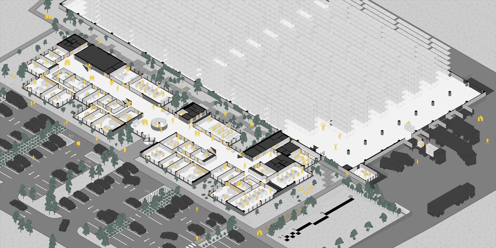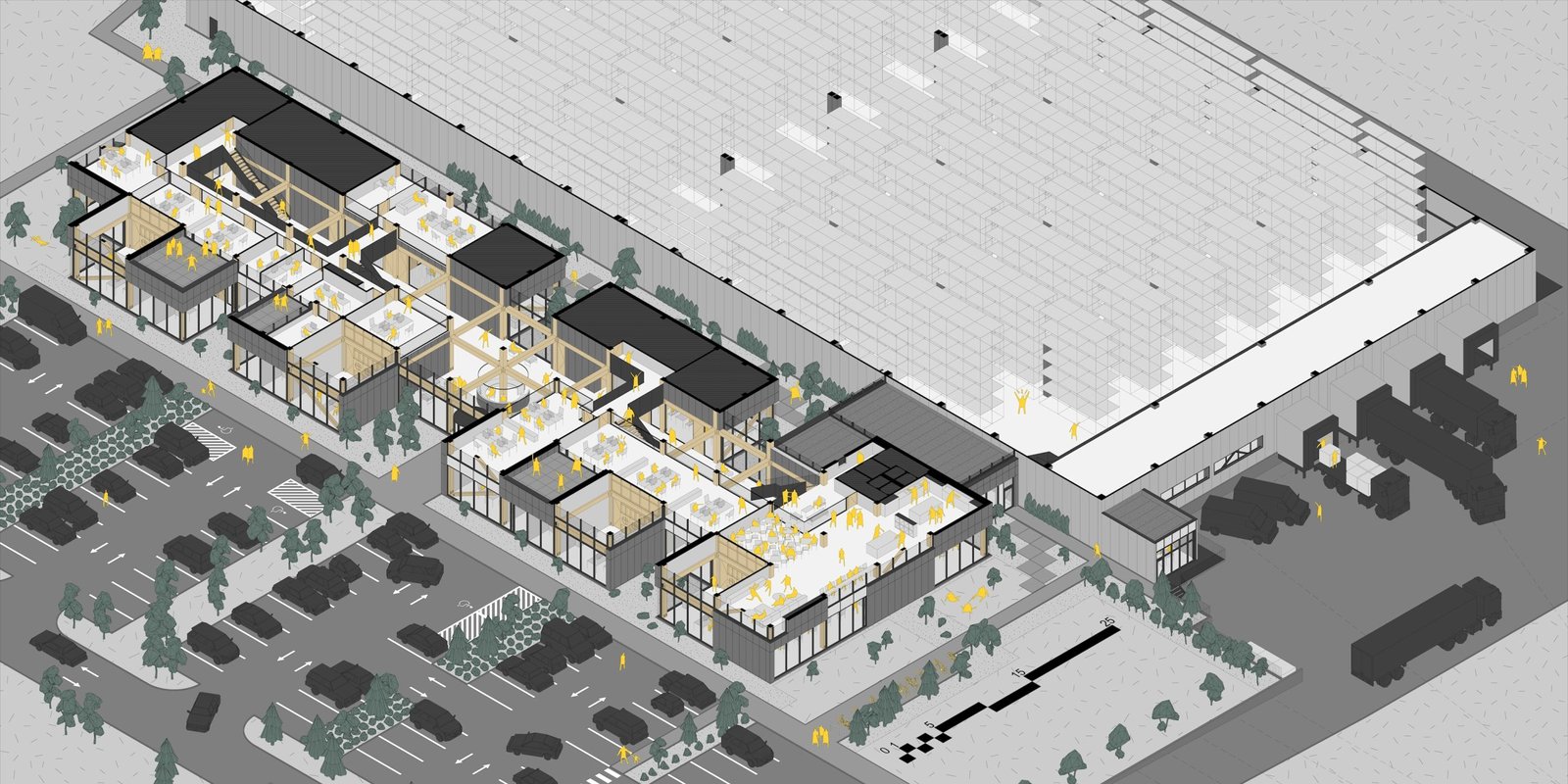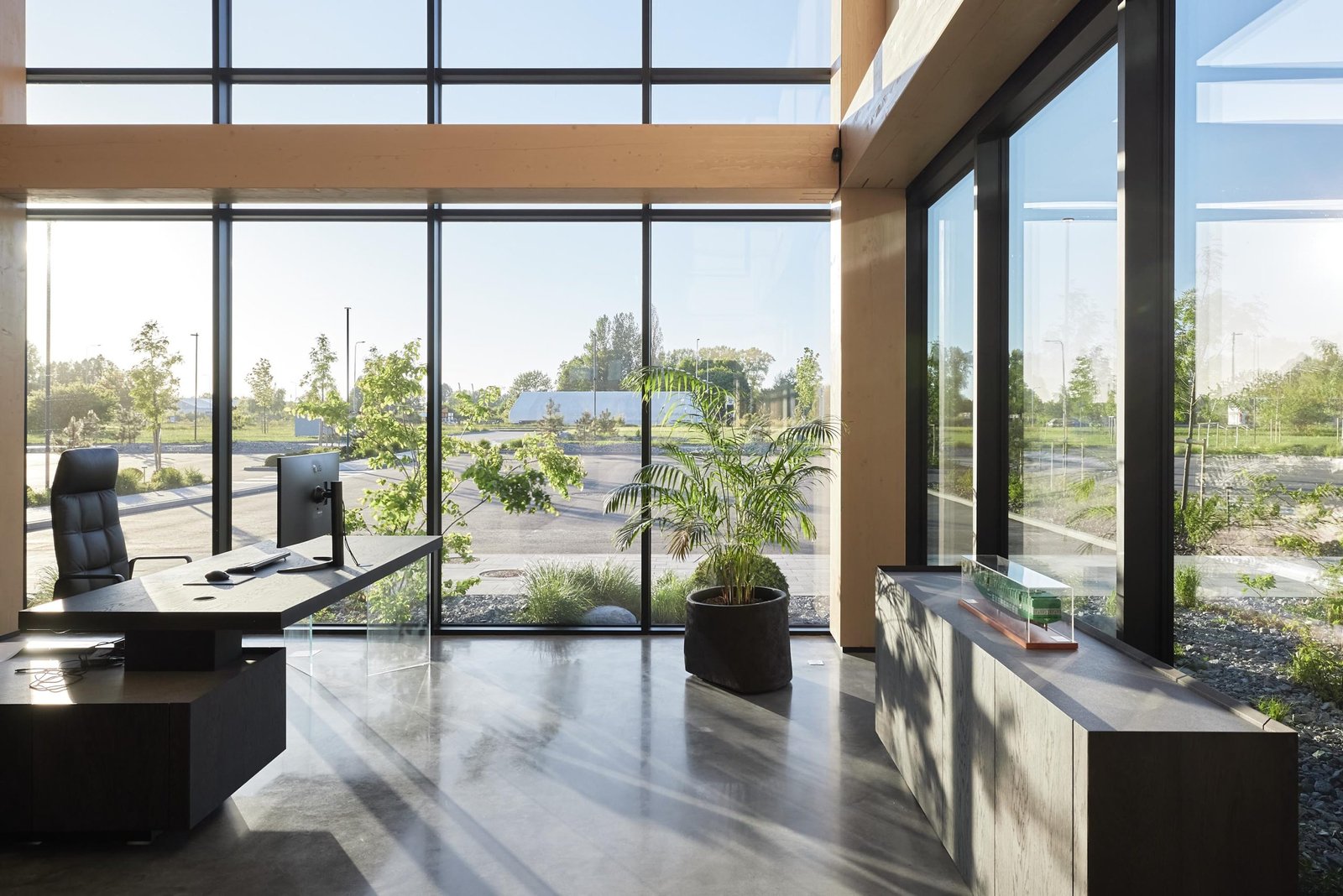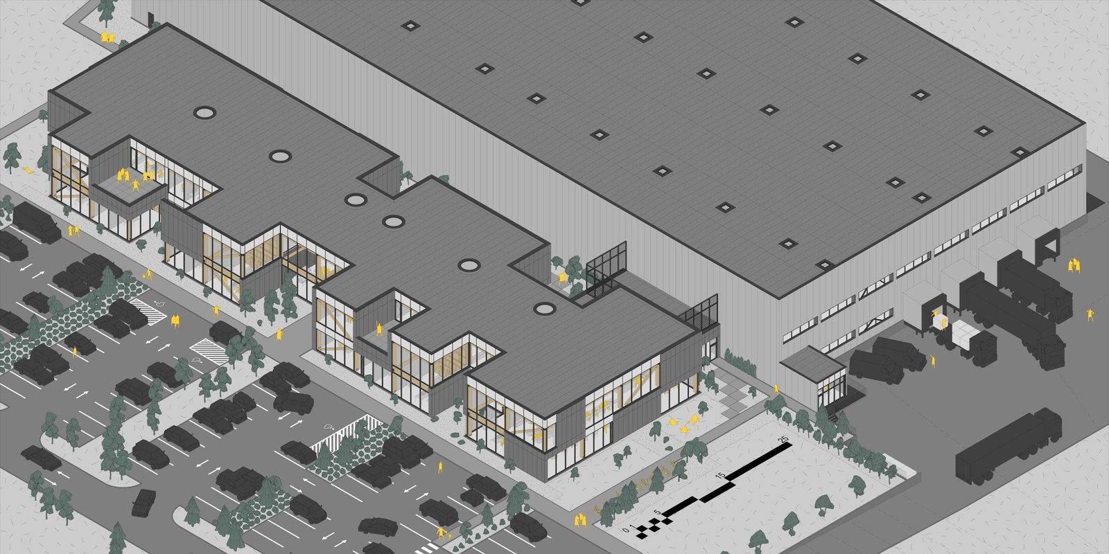The facade blends glass, concrete, and wood. Repetitive window rhythms and façade recesses add depth and break up the long mass. The administrative volume extends slightly beyond the warehouse, making a confident, modern statement toward the street.