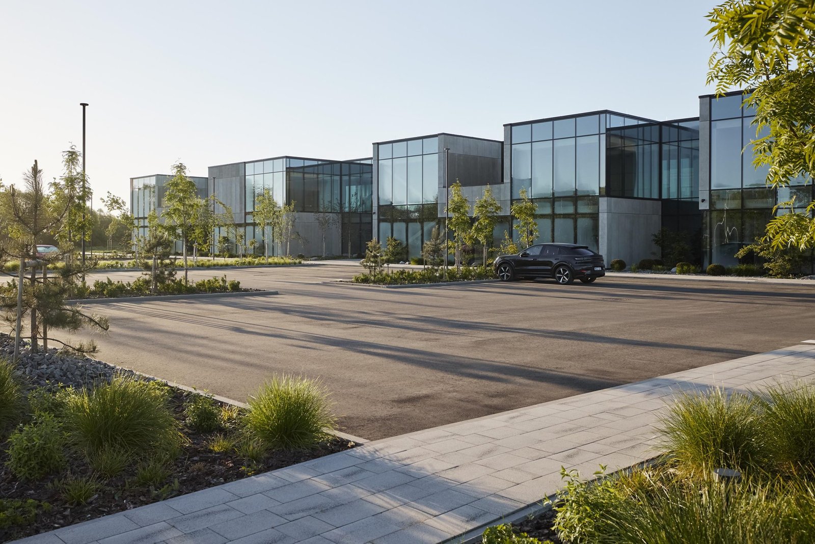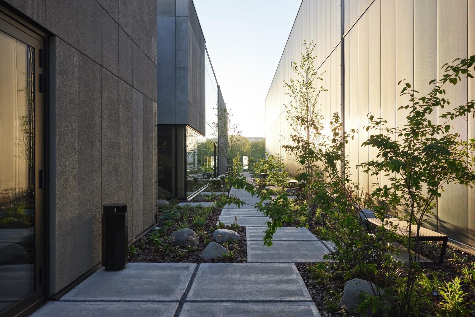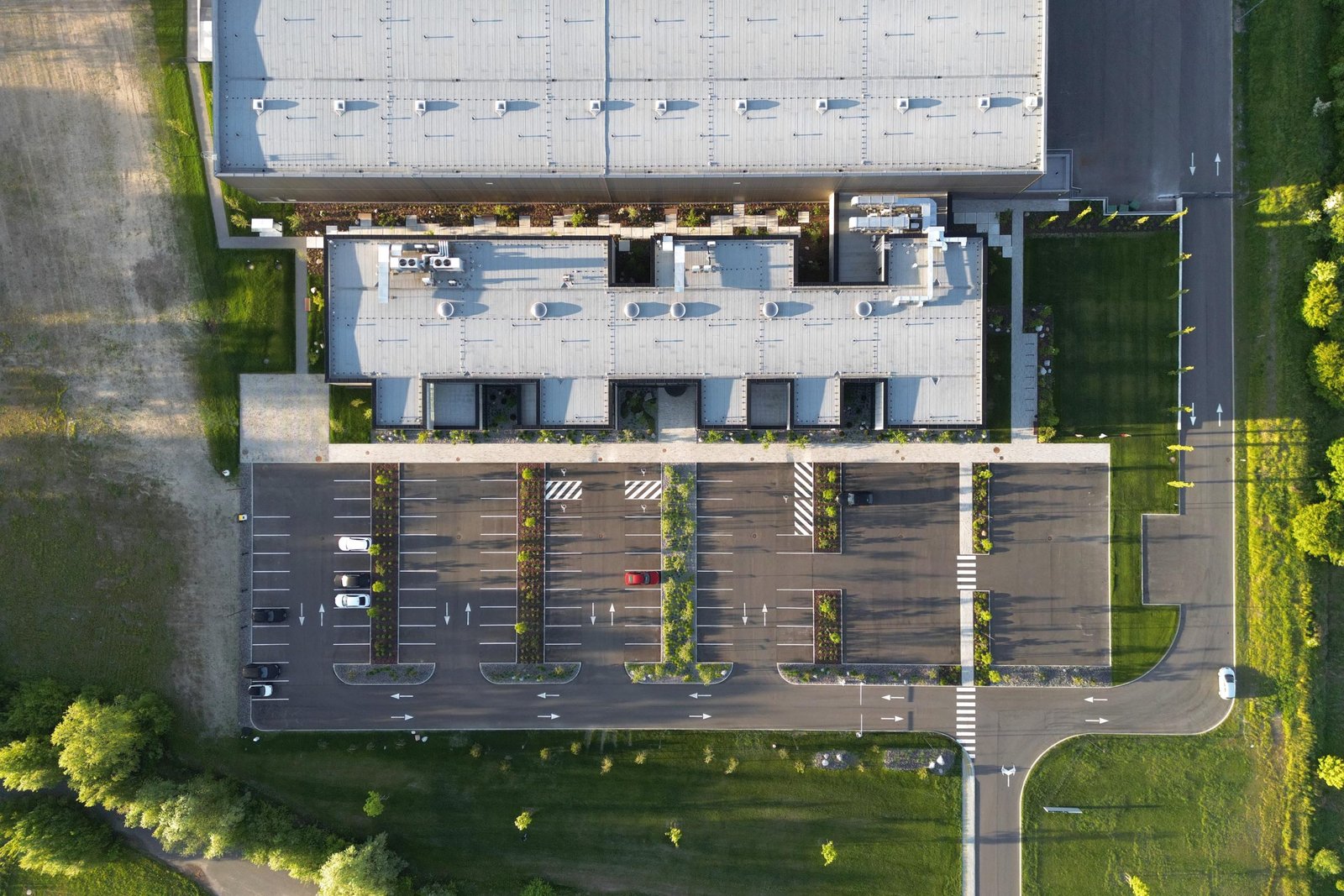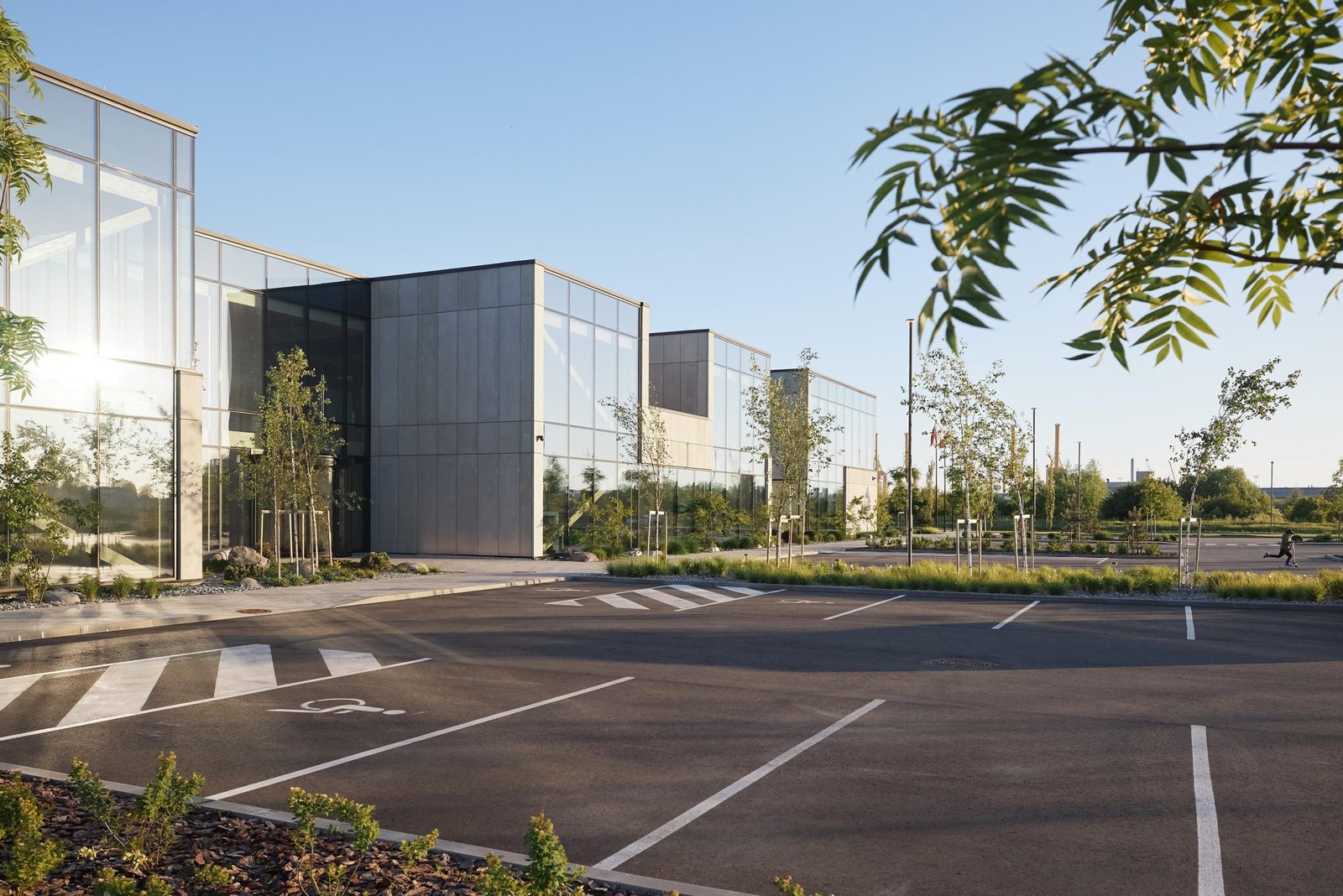 The facade blends glass, concrete, and wood. Repetitive window rhythms and façade recesses add depth and break up the long mass. The administrative volume extends slightly beyond the warehouse, making a confident, modern statement toward the street.