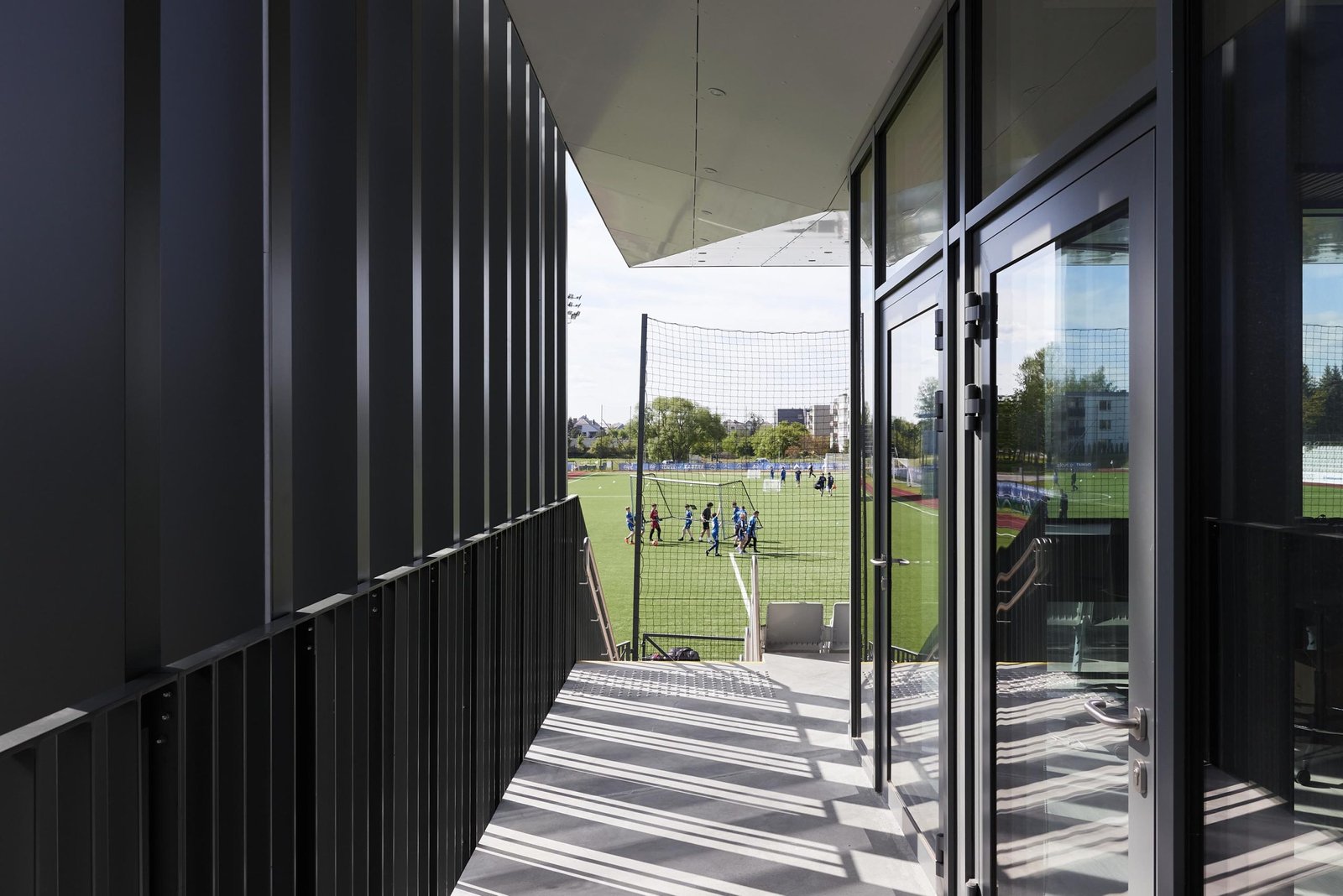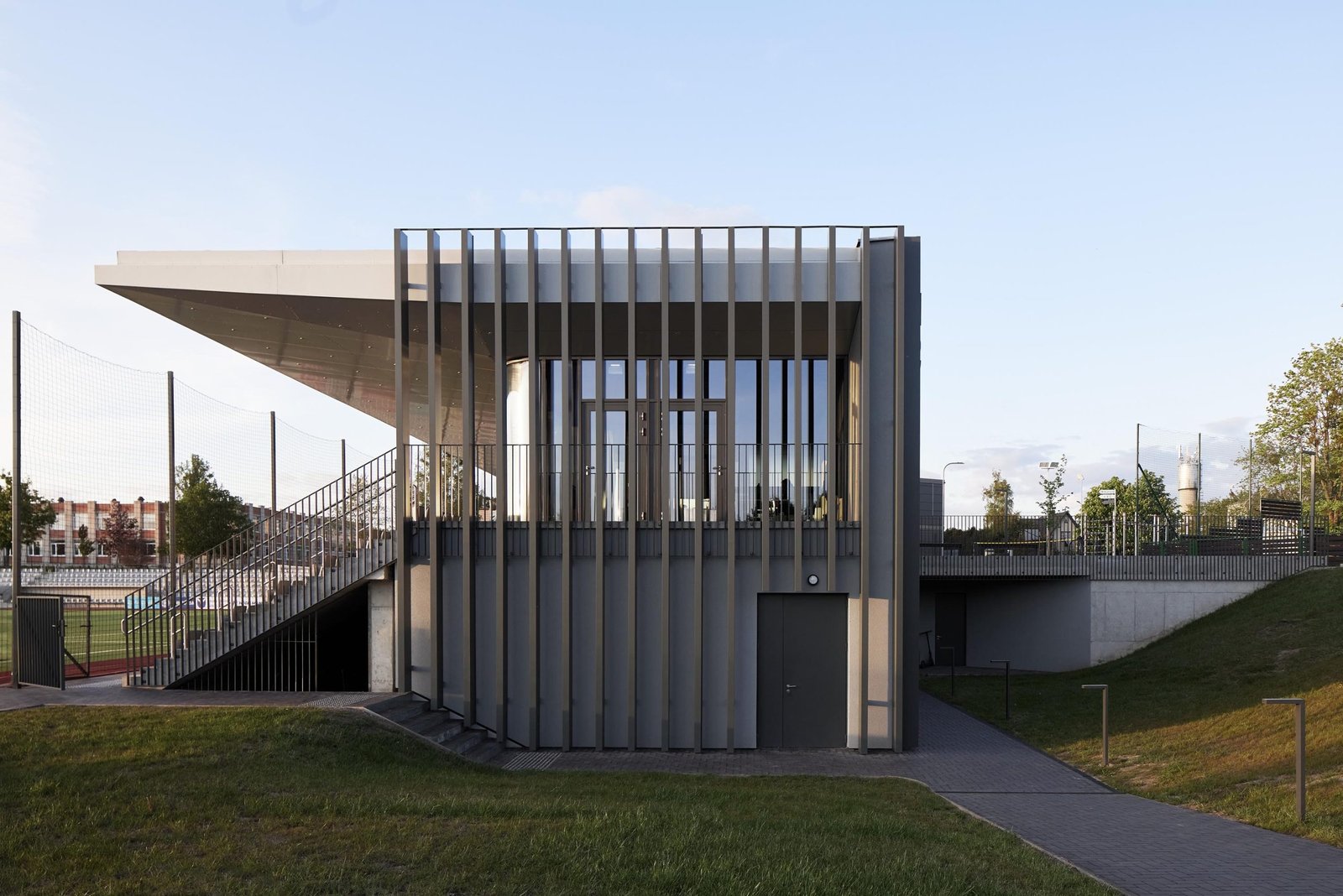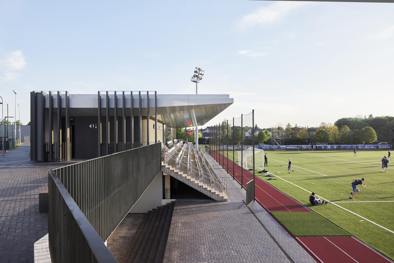The second phase will introduce a two-storey covered grandstand building with auxiliary rooms. The rectangular structure will blend visually with the nearby planned school through the use of matching materials such as vertical grey metal lamellae and concrete in clinker tones. This visual consistency helps integrate the stadium into the broader educational campus.