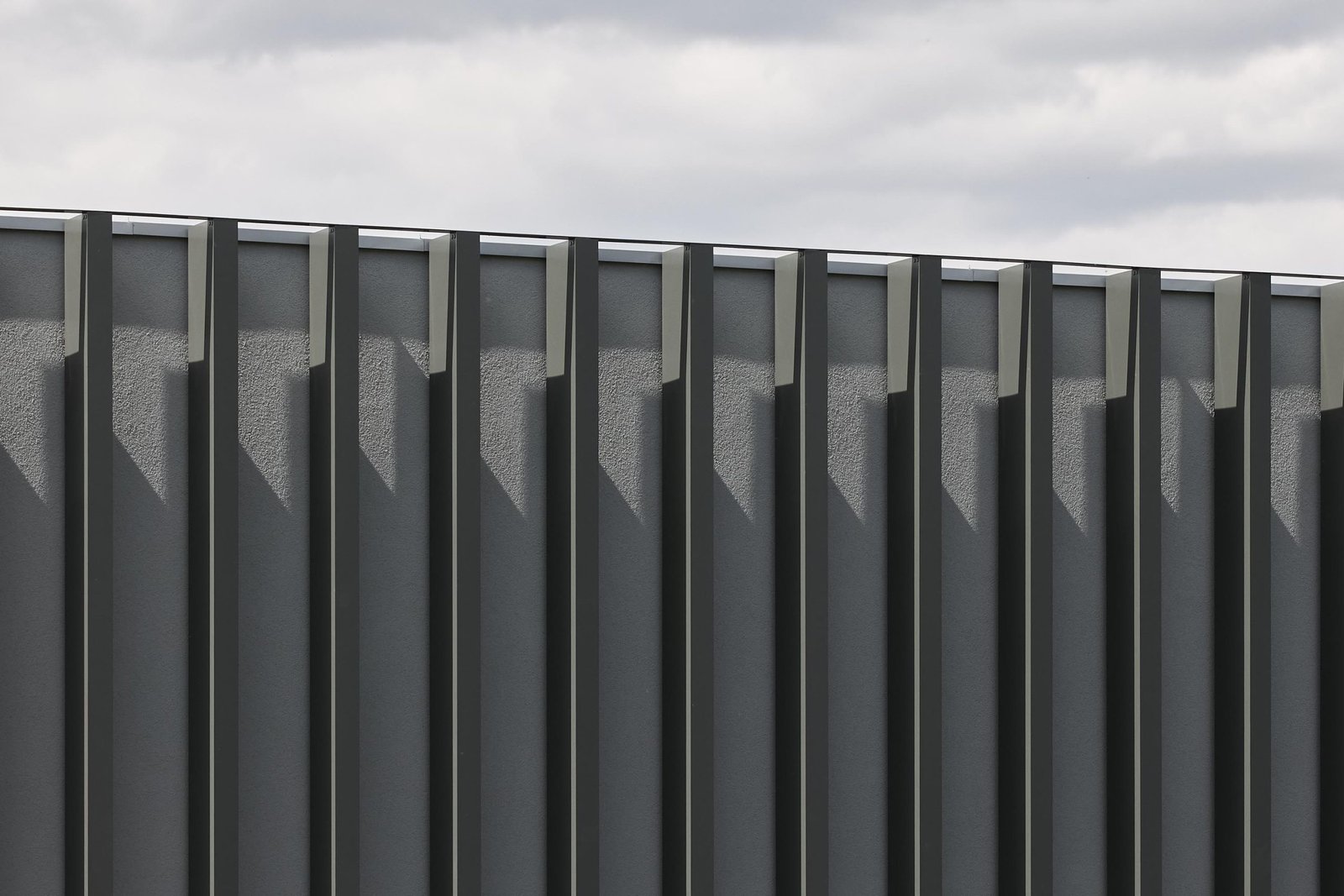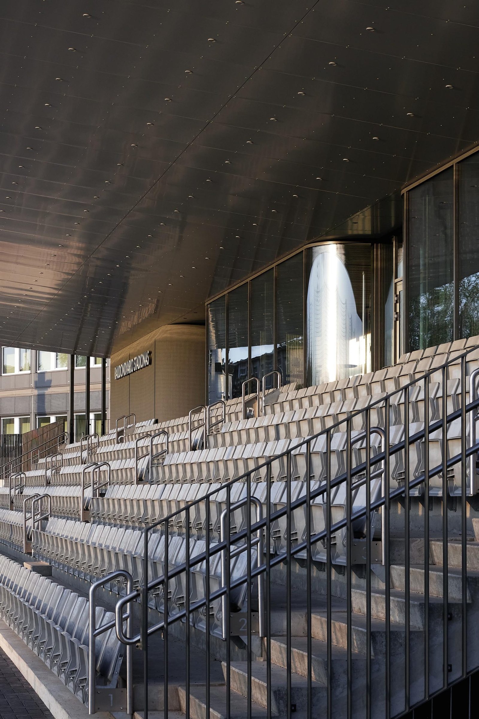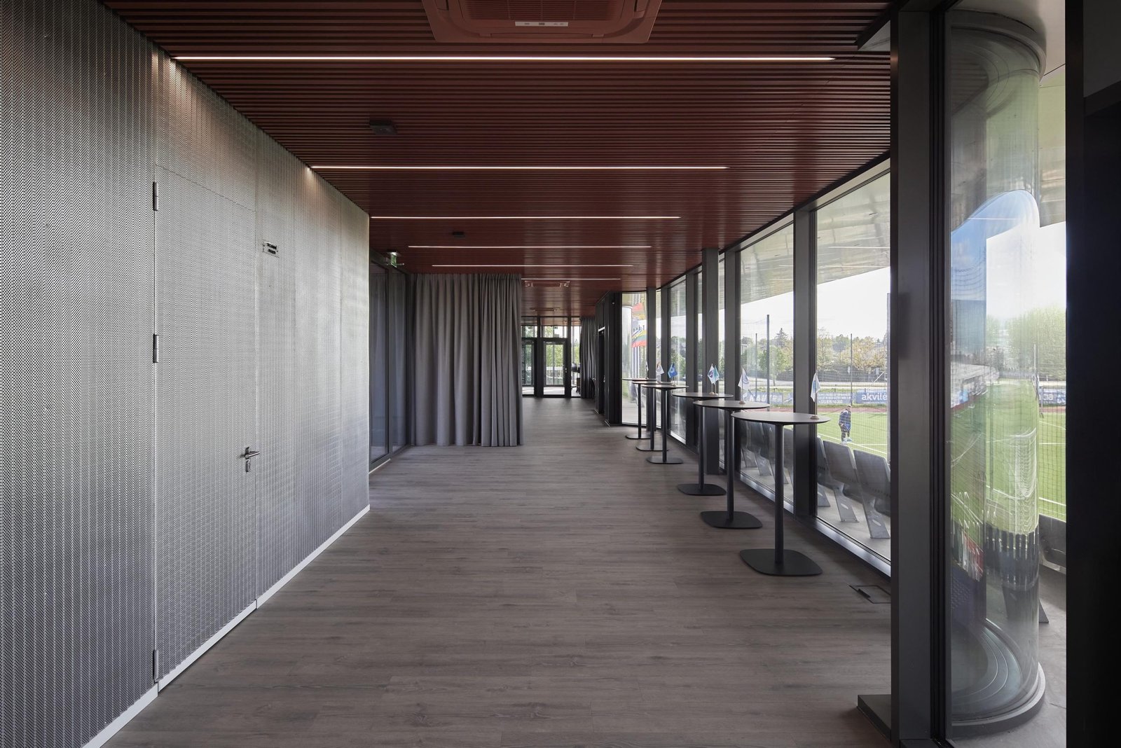 The second phase will introduce a two-storey covered grandstand building with auxiliary rooms. The rectangular structure will blend visually with the nearby planned school through the use of matching materials such as vertical grey metal lamellae and concrete in clinker tones. This visual consistency helps integrate the stadium into the broader educational campus.