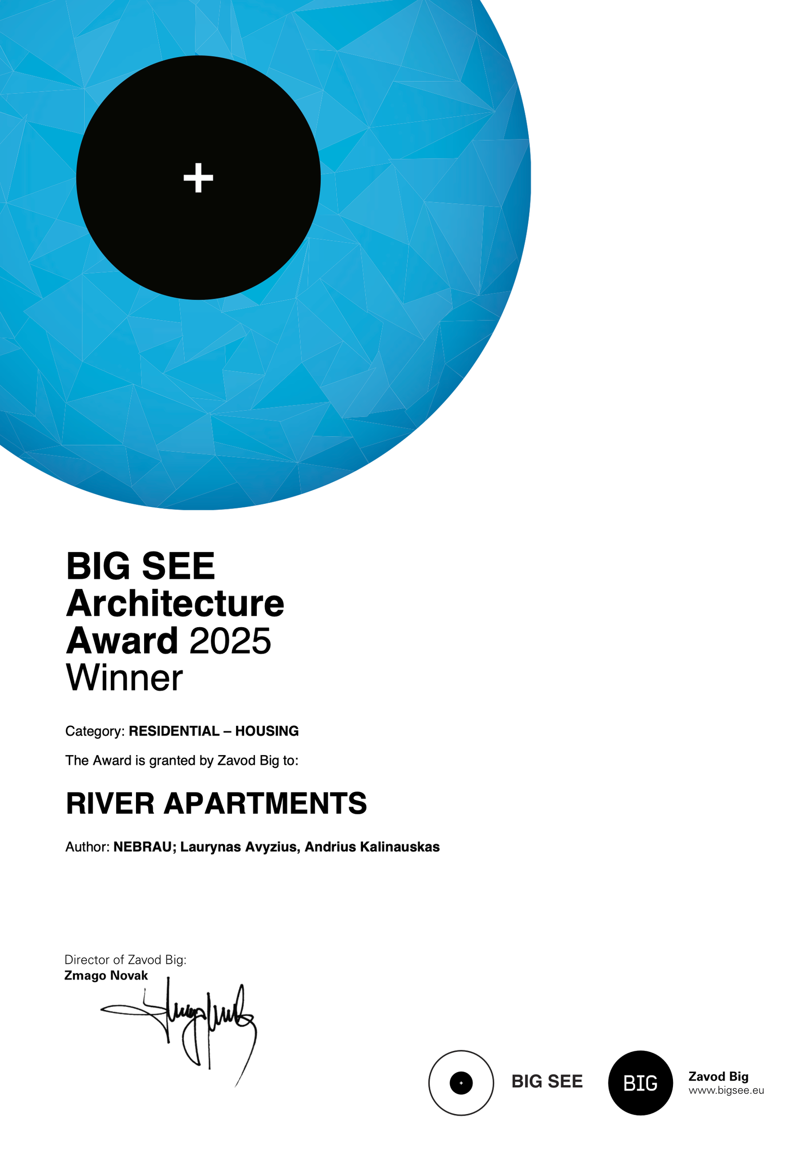 River Apartments is a modern residential complex along the Nemunas River in Kaunas. It features two buildings—7 and 8 stories high—with 40 spacious units ranging from 51 to 163 m². Over 70% of the apartments exceed 90 m², each offering river views through wide windows, generous balconies, and green terraces that bring nature into daily life.